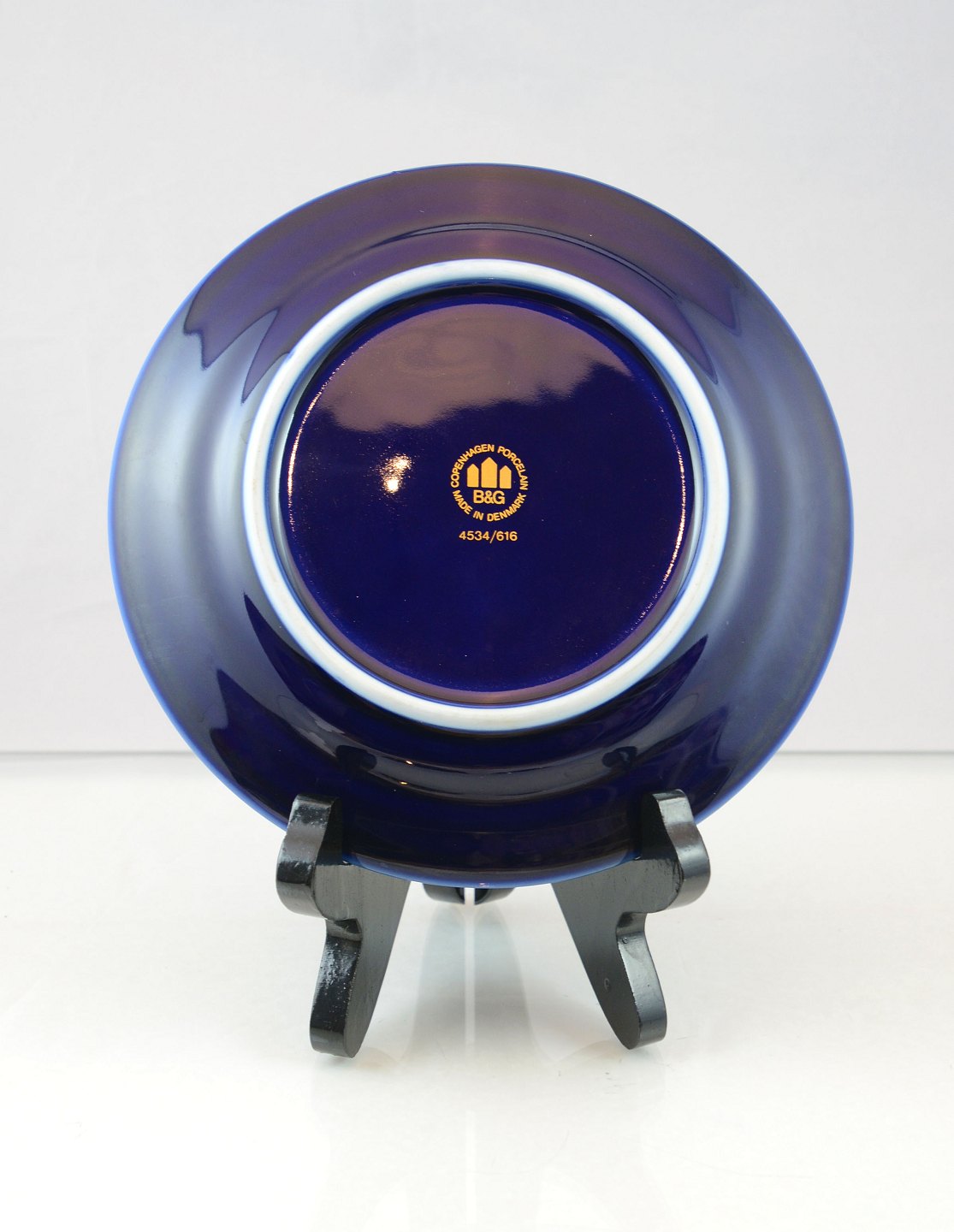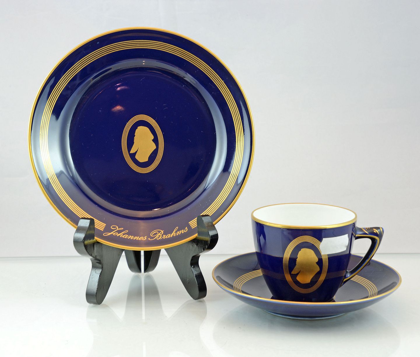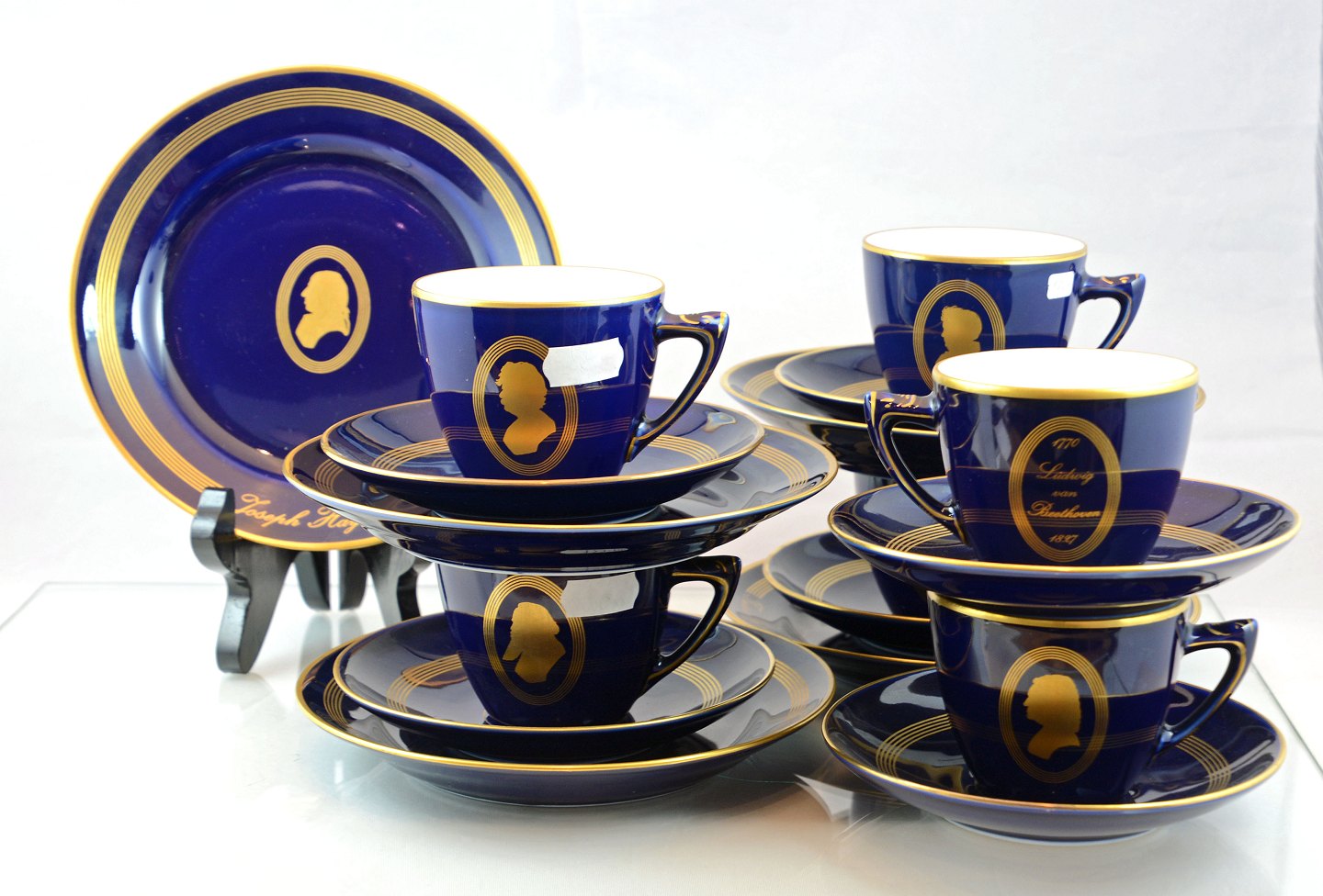 Kaffestellet Komponist fra Bing og Grøndahl. Blåt porcelæn med forgyldte silhuetter og skrift.
