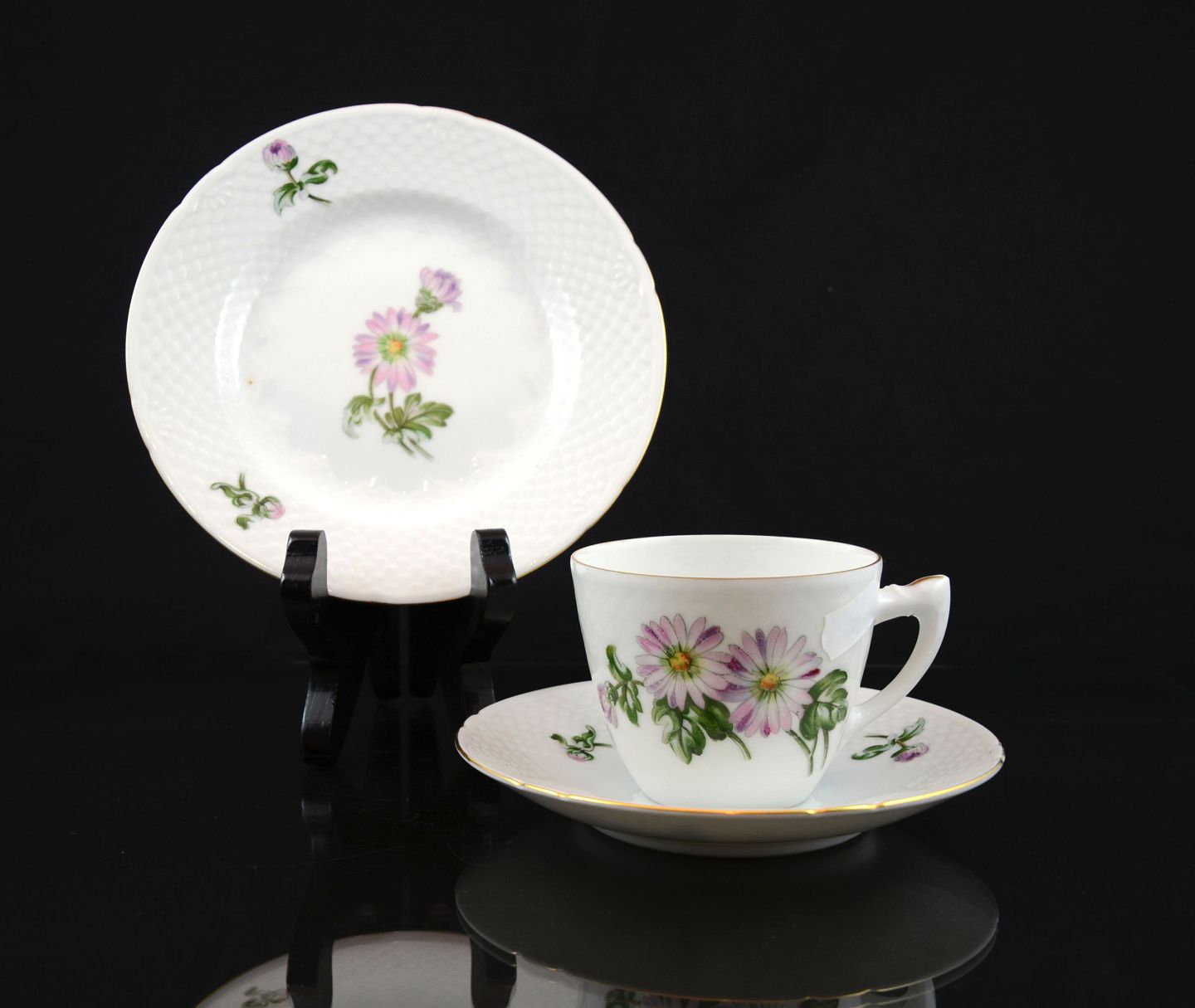 Krysantemum stel fra Bing og Grøndahl. Hvidt skelformet porcelæn med guldkant og blomstermotiv. 1. sort. Mindre brugsspor på guldkanten kan forekomme.