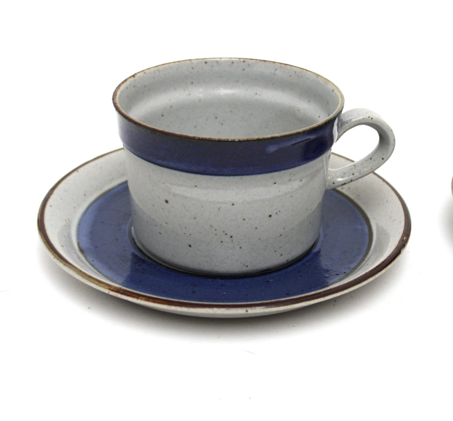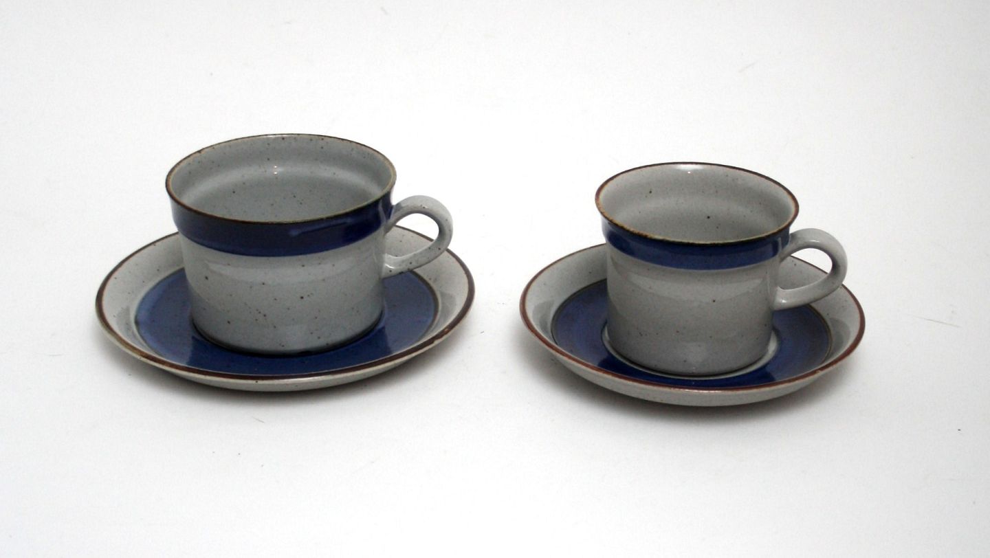 Text available in Danish: Knabstrup, Christine stentøjsstel grå glasur med blå kant. Designet af den tyske kunstner Christine Konschak, som var tilknyttet Knabstrup i perioden 1967-1970.