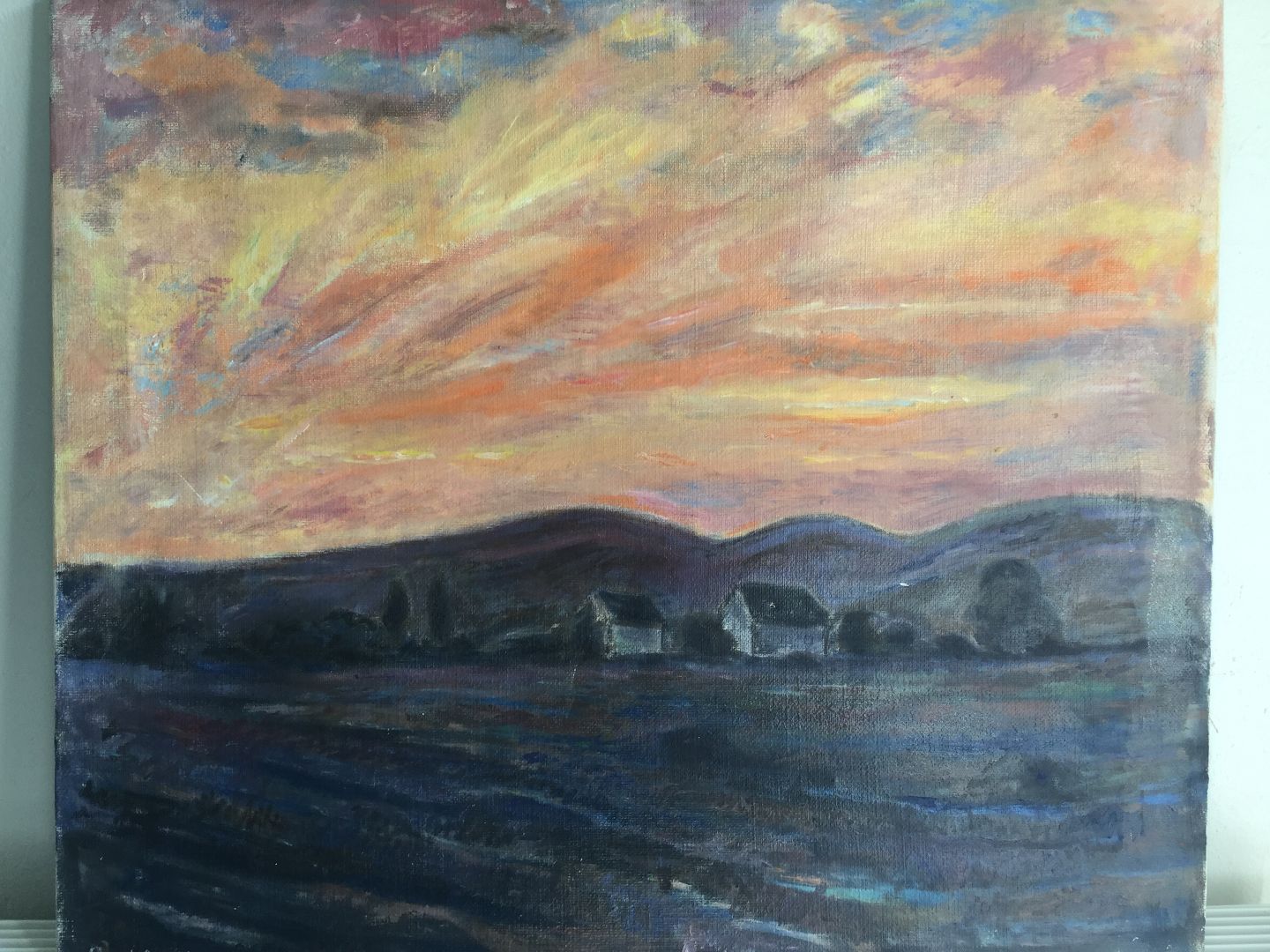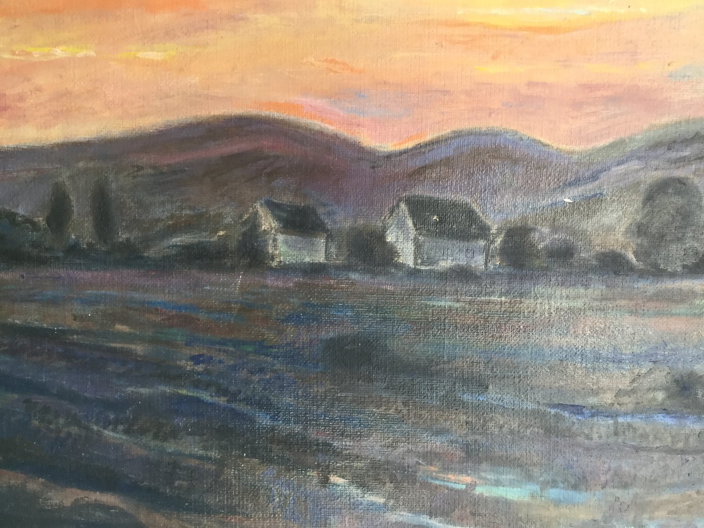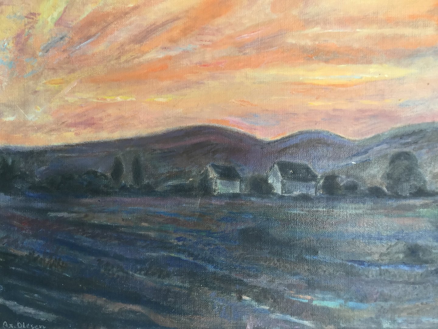 Maleri af Bent Axel Olesen - Huse ved solnedgang 1977.
