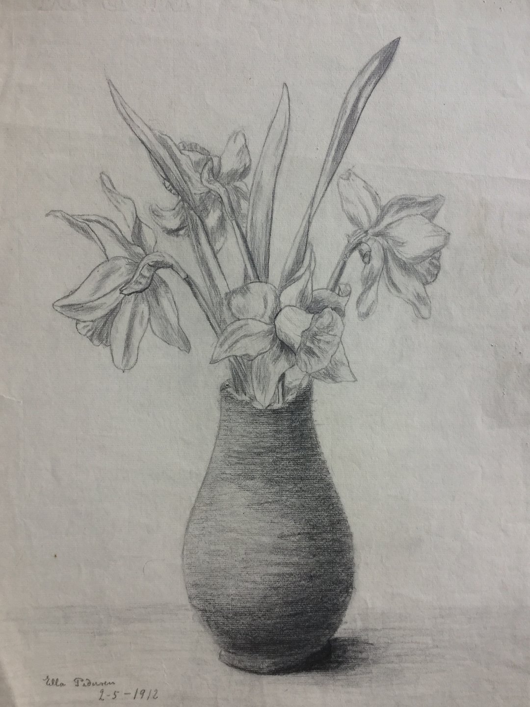 Text available in Danish: Tegning af Ella Pedersen 1912 - vase med påskeliljer.