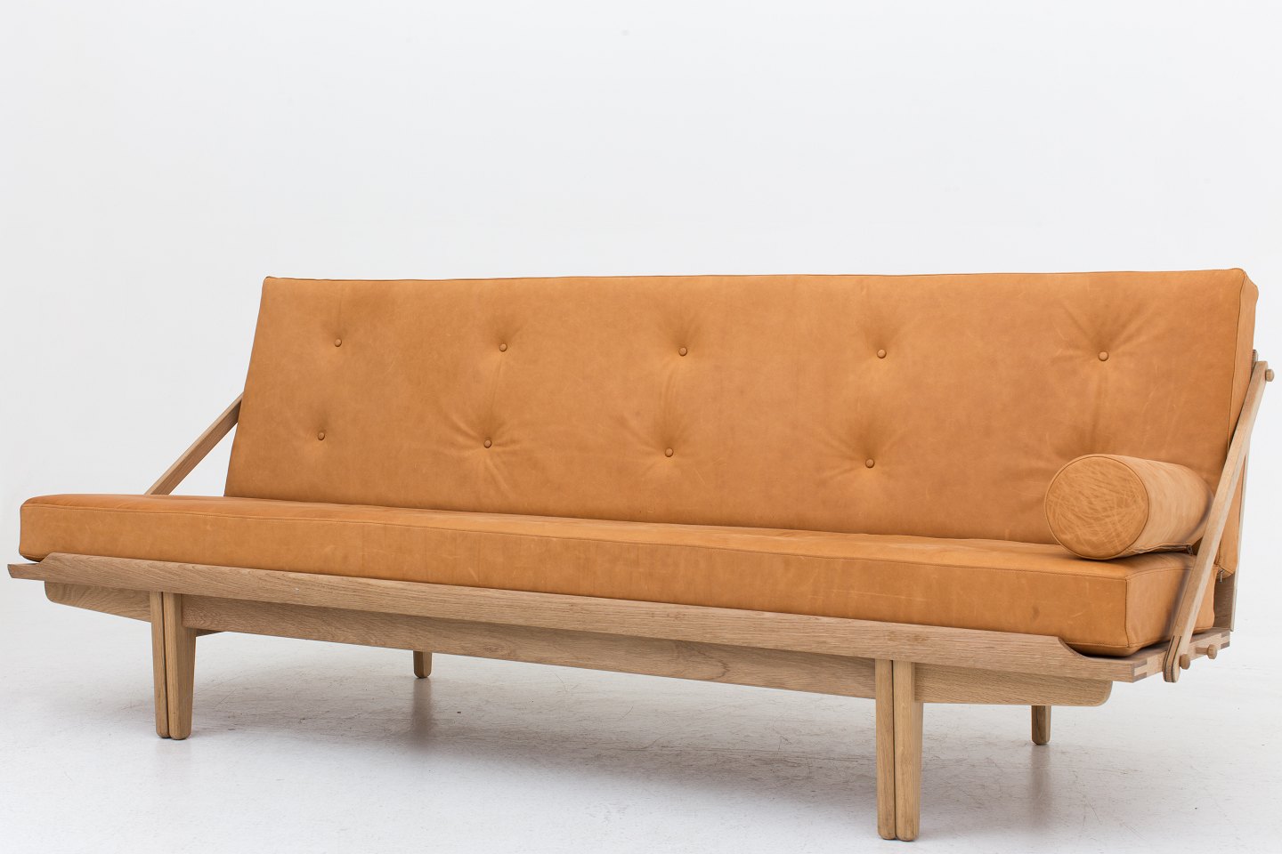 Daybed i eg, betrukket med Dunes Cognac-læder