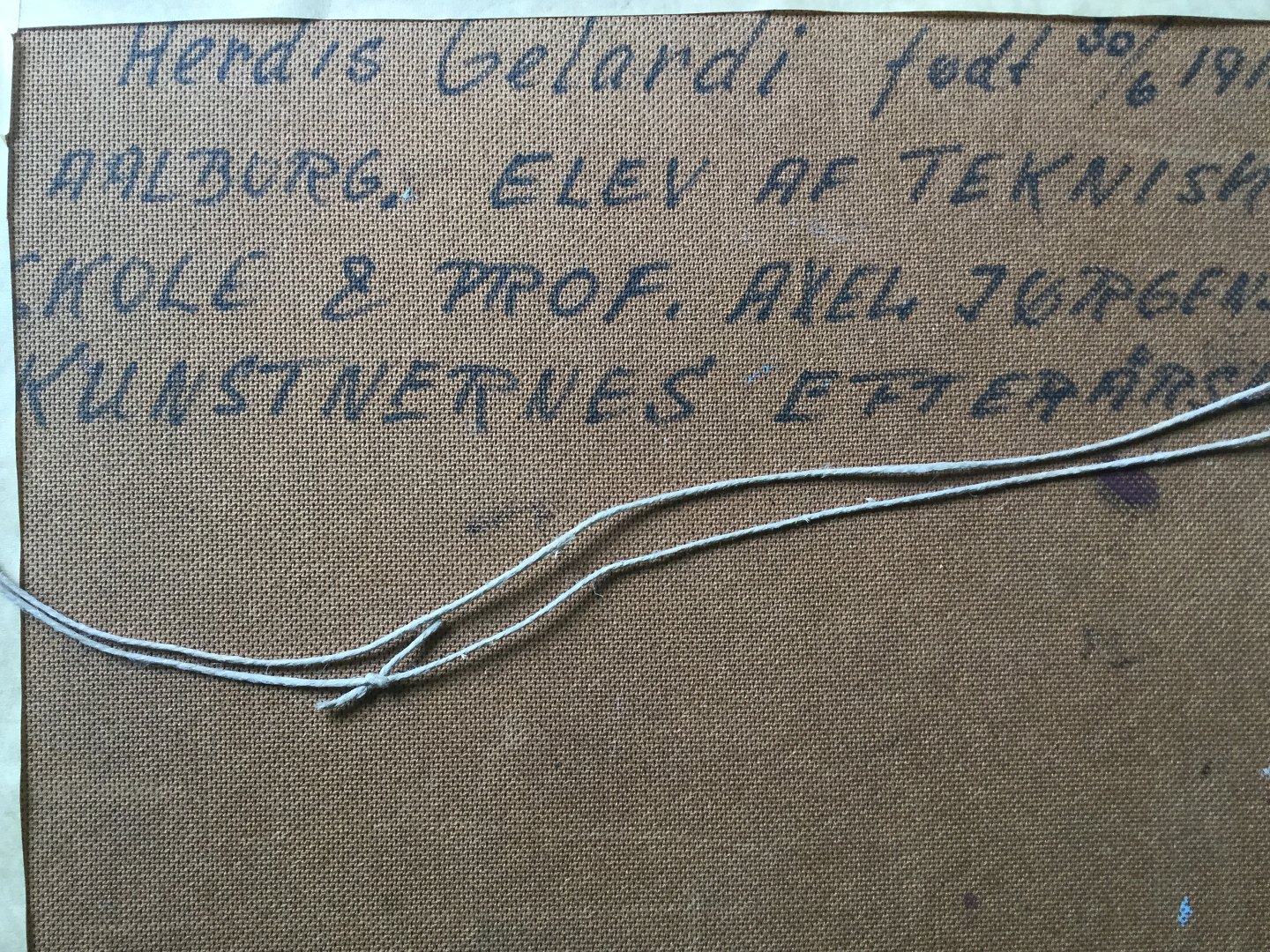 Herdis Gelardi er bl.a. uddannet fra malerskolen ved Aksel Jørgensen og Immanuel Ibsen 1940-42. Gelardi har udstillet på Charlottenborg i perioden 1949-1975, samt KE 1944-46.
