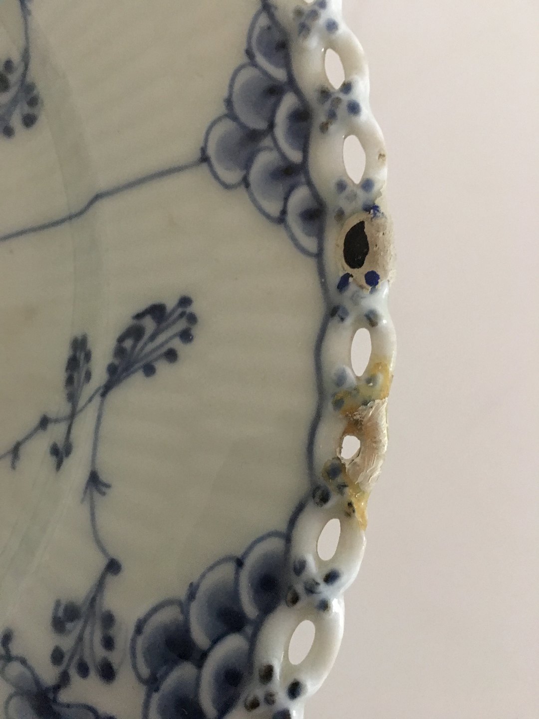 Royal Copenhagen Antik Musselmalet Helblonde Tallerken. Måler 23.5 cm dia. / 9 1/4 in. Tallerkenen har et skår på blondekanten, og yderligere skåret og repareret to steder.