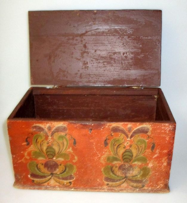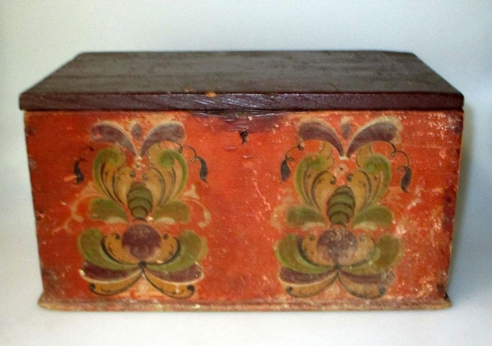 Antikt rosen malet almue skrin, 19. årh. Norge. Rød malet med roser. Låg - senere - brunmalet. Længde.: 26,5 cm. B.: 15 cm. Højde.: 14 cm.