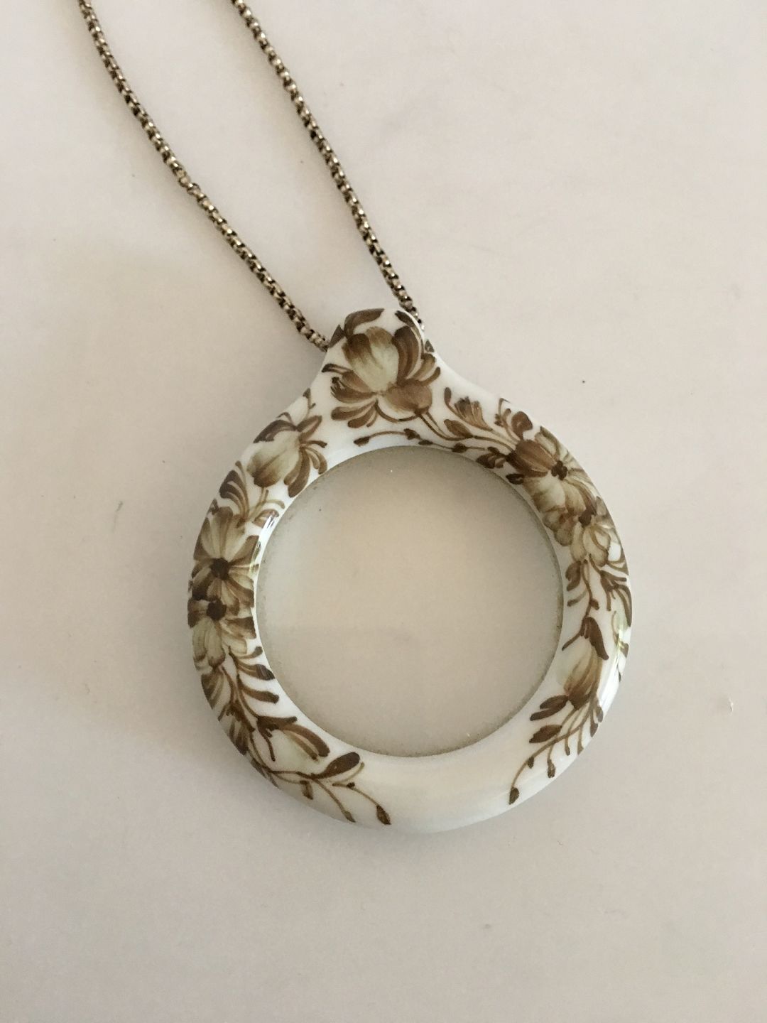 Royal Copenhagen Porcelæns vedhæng med Forstørrelsesglas / Lup. Måler 5.6 cm diameter. Kæden måler 94 cm L. Vejer 58 gram.