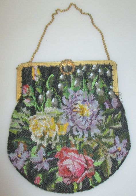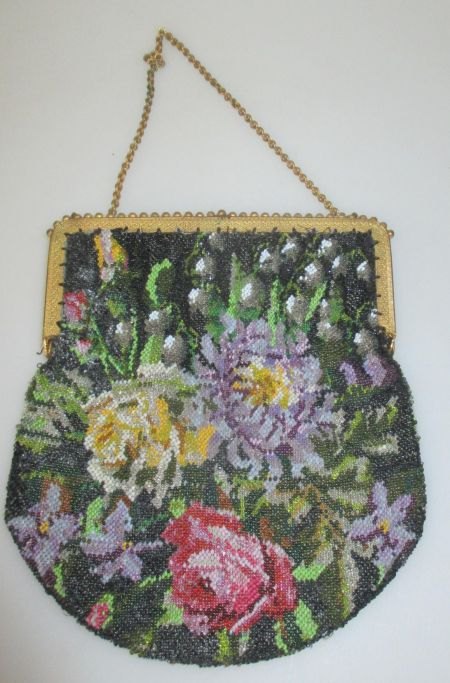 Bag, glass bead work, 20th century. With decoration in the form of roses. With bracelet and handle in gold-plated brass. 17 x 15 cm.