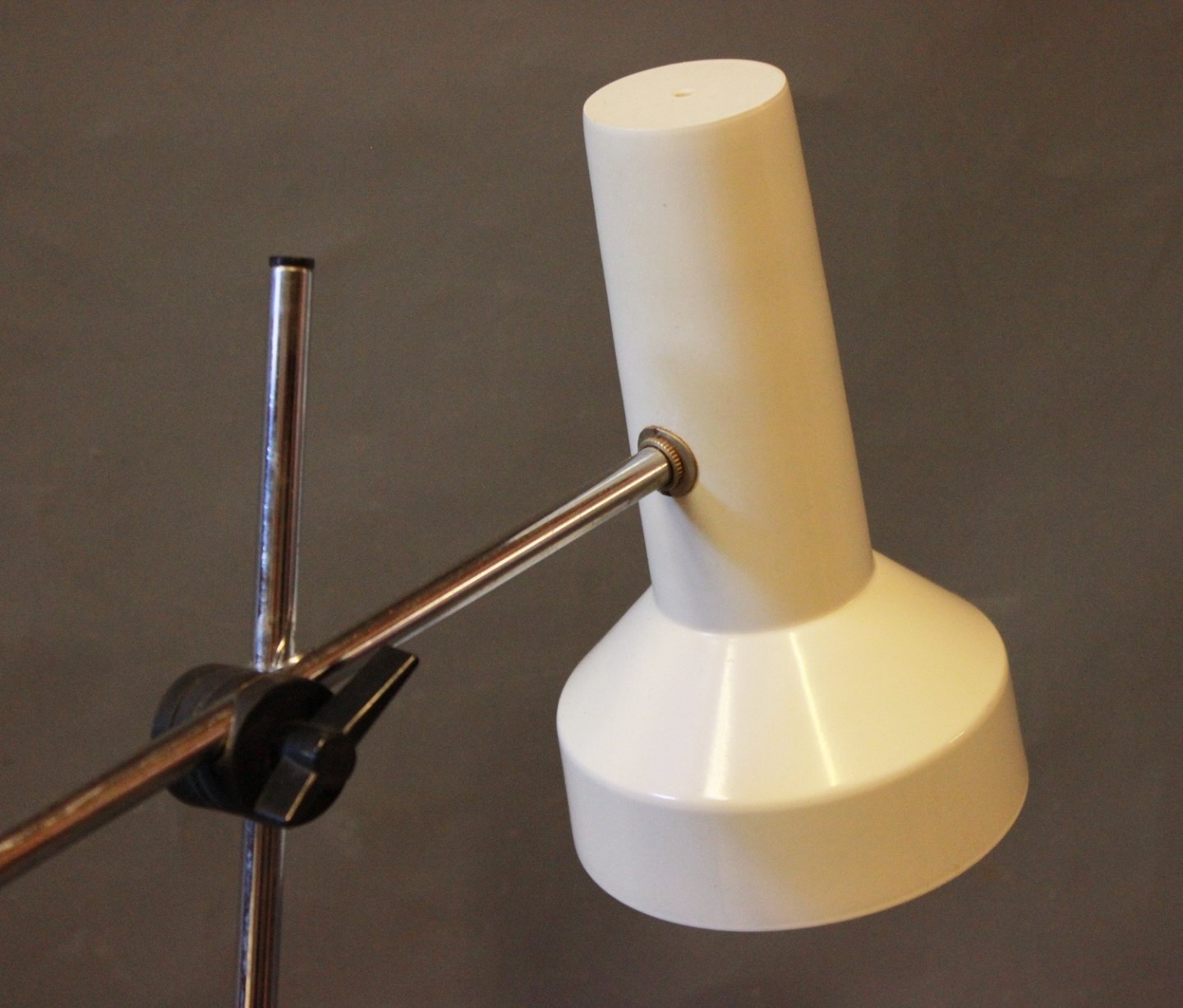 Desk lamp with white lacquered shade and foot and frame of chrome.