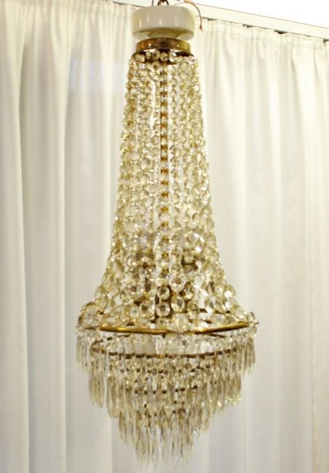 Stor prismekrone, 19. årh. Danmark. Højde.: 82 cm. Dia: 36 cm. Til 5 lys pærer. Med 708 prismer.