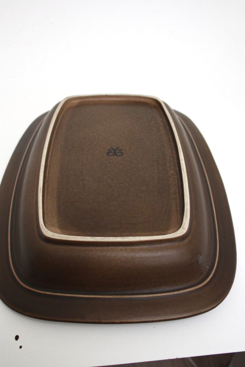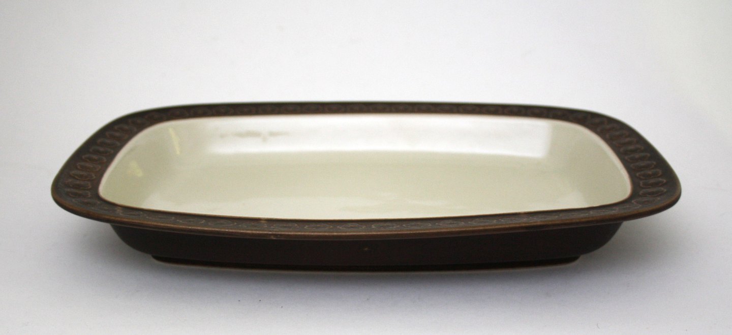Kronjyden, Umbra, Dybt aflangt fad designet Jens Harald Quistgaard i 1950'erne. Længde 34 cm. Bredde 24,5 cm. Højde 4,5 cm. Flot stand. Pris: 675 kr.