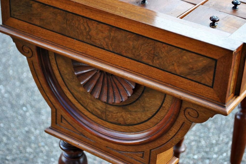 Dansk sybord i valnød, ca. 1880. Med fire drejede ben og benstøtte. Dekoreret kant. Plade med intarsia. Med indlagt valnødde rod. Indvendig med 13 rum med låg. H: 73 cm. B: 54 cm. D: 42 cm.