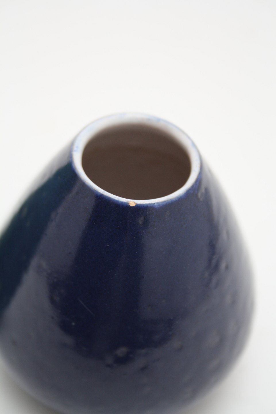 Blå. Formnr. 408. Højde 6,5 cm. Diameter 6 cm. Lille glasurafslag i kanten. Pris: 225 kr.