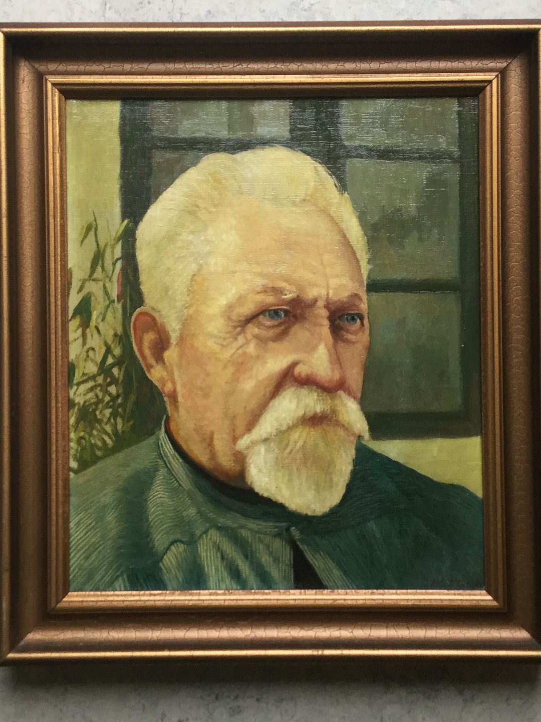 Maleri - portræt af ældre mand ved hus.