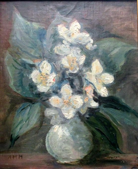 Hansen, Ane Marie (1852 - 1941) Danmark: Blomster i en vase. Olie på lærred/pap. Signeret: AMH. 21 x 17,5 cm.