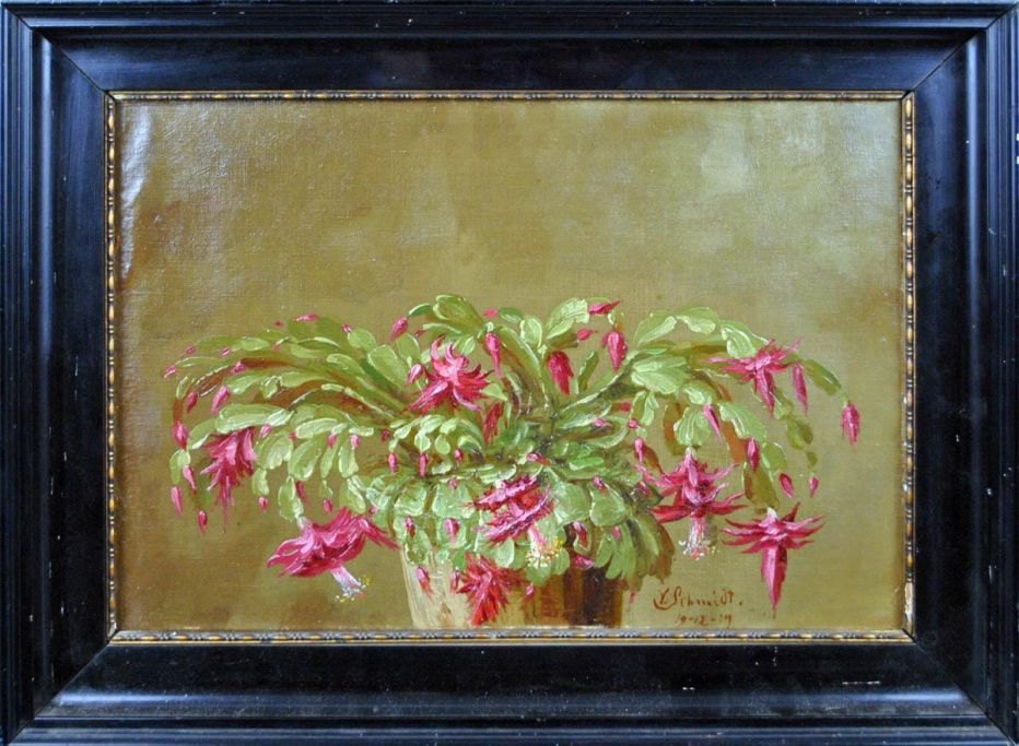 Schmidt, V. (19. årh.) Danmark: Opstilling med plante. Olie på lærred. Signeret.: V. Schmidt. 23 x 33 cm.