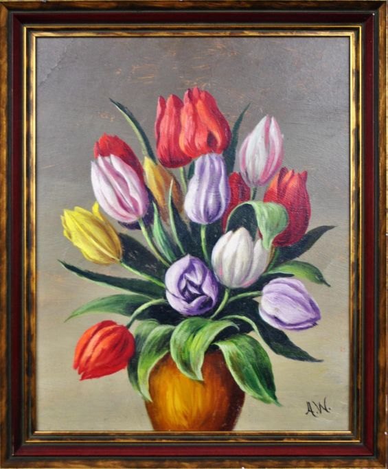 Westphal, Anna, (1868 - 1950). Tulipaner. Olie på plade. Signeret: Monogram. 30 x 24 cm.