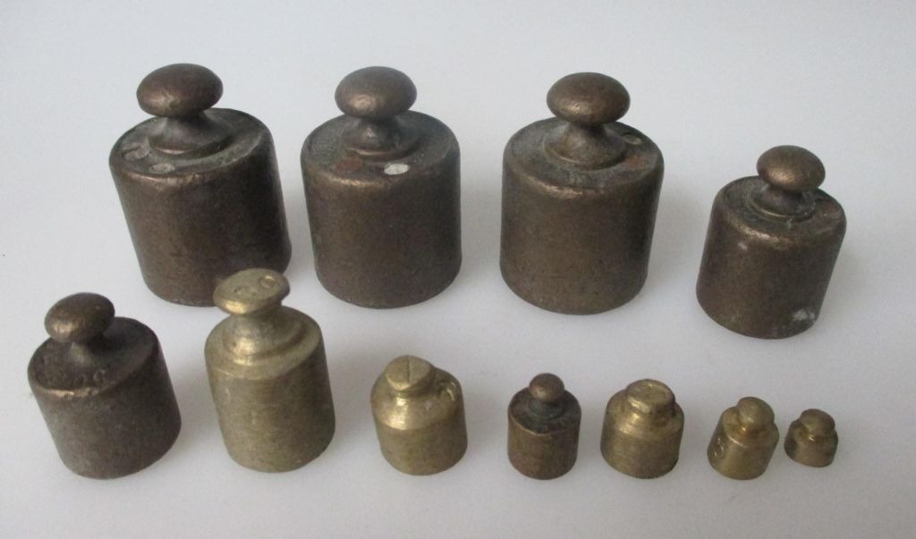 Gold weight in brass with 11 Weights, 19/20. C. Norway.