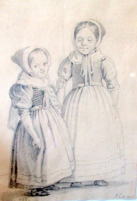 Exner, Julius (1825 - 1910) Denmark: Two girls in folk dress. Signed: J. Exner. 24 x 19 cm.