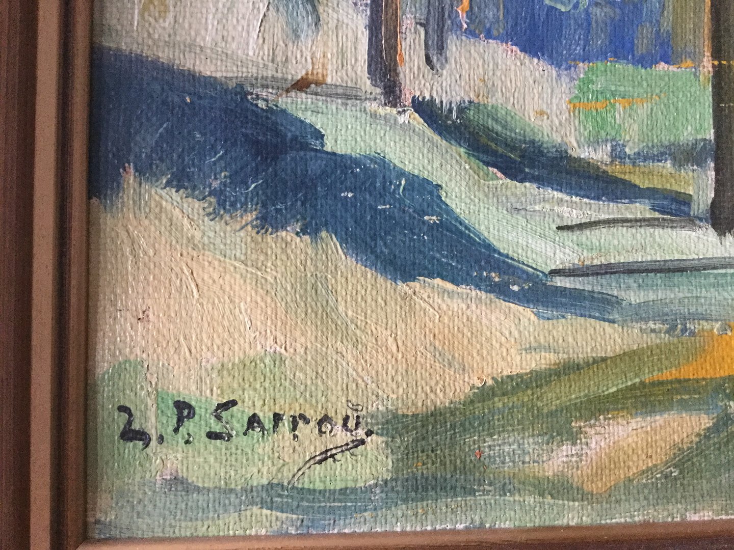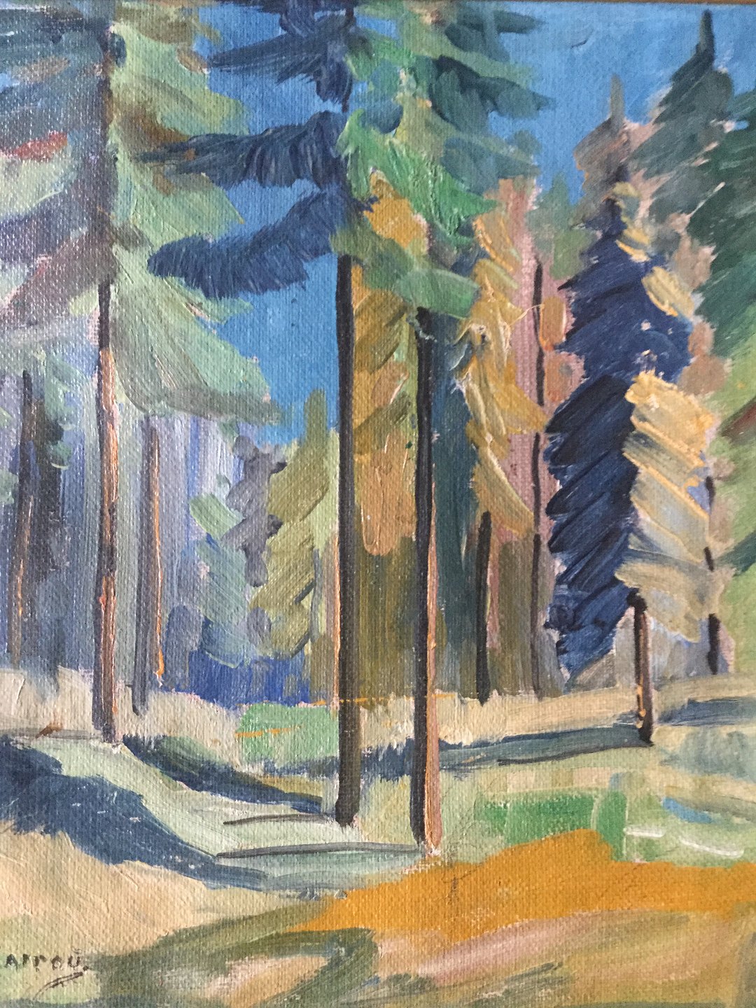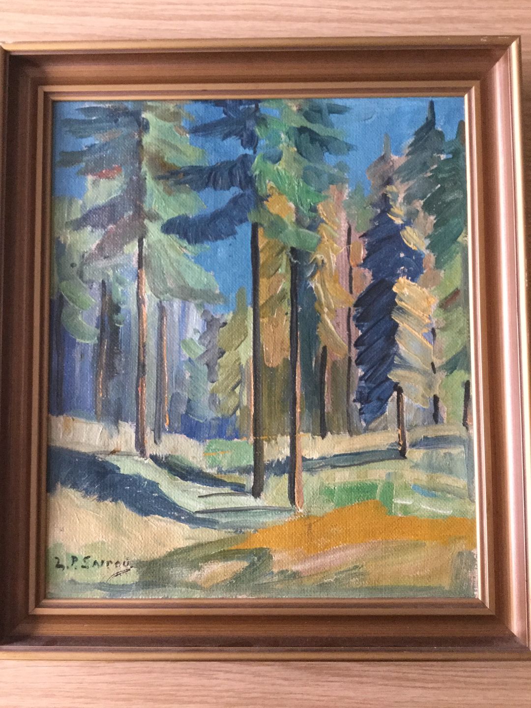 Maleri af L.P. Sarrou - Nåletræer i skov.