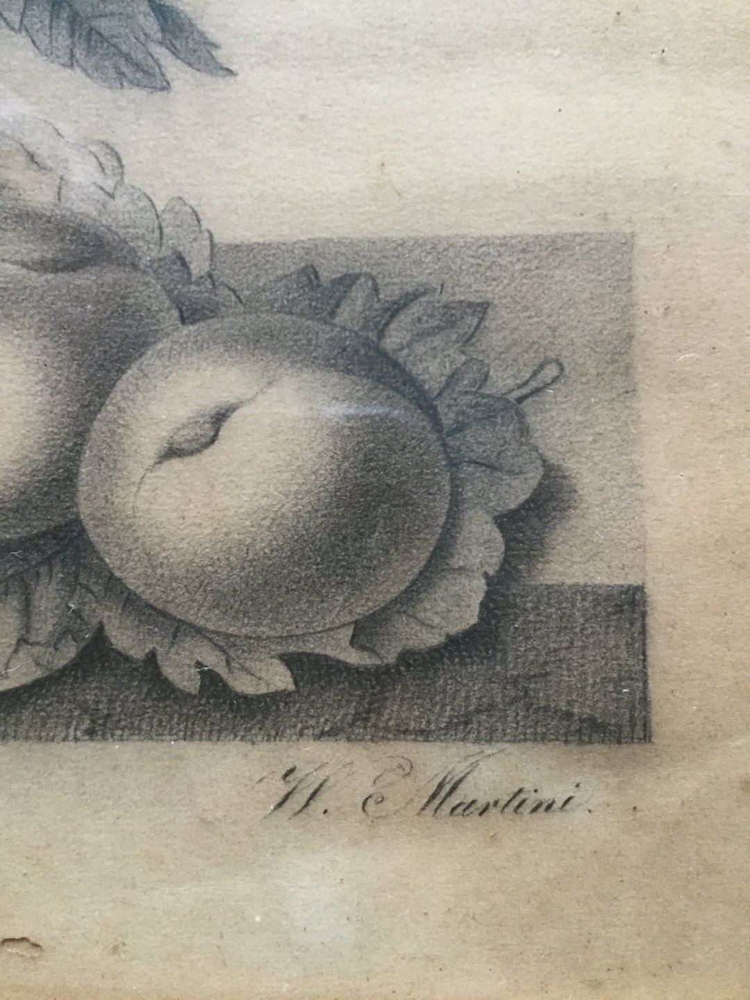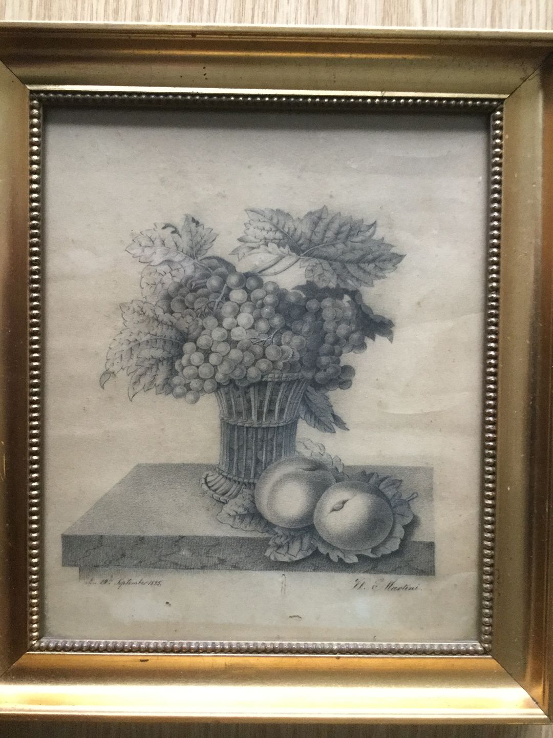 Text available in Danish: Tegning af W. E. Martini 1855 - Opstilling på stenkarm med frugtkurv.