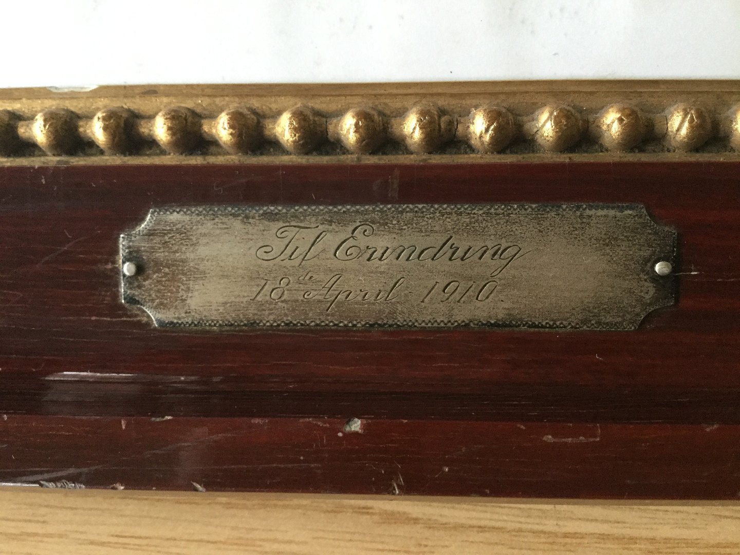 Nusset passepartout og ramme med defekter og sølvplakette "Til Erindring 18' april 1910".