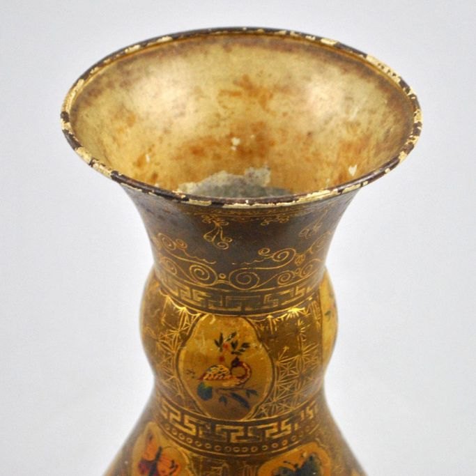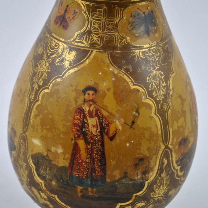 Painted metal vase. 19th century. Decorated in transfer technology with Europeans in Chinese suits and hand-painted gildings. 19th century H: 33 cm.
