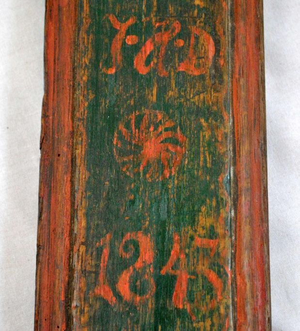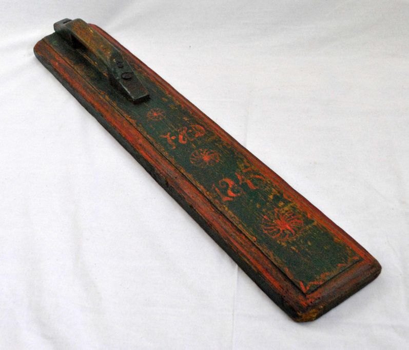 Manglebræt, Danmark, 1843. Bemalet egetræ i grønt og rødt. Med håndtag. Med initialerne: JHD 1843. Længde: 63 cm.