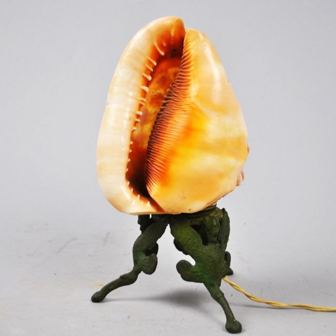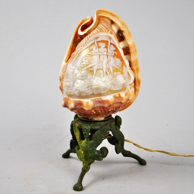 Napolitansk camè lampe. 19. årh. Dekoreret med tre gratier. H.: 19 cm. På fod af grønmalet  metal.
