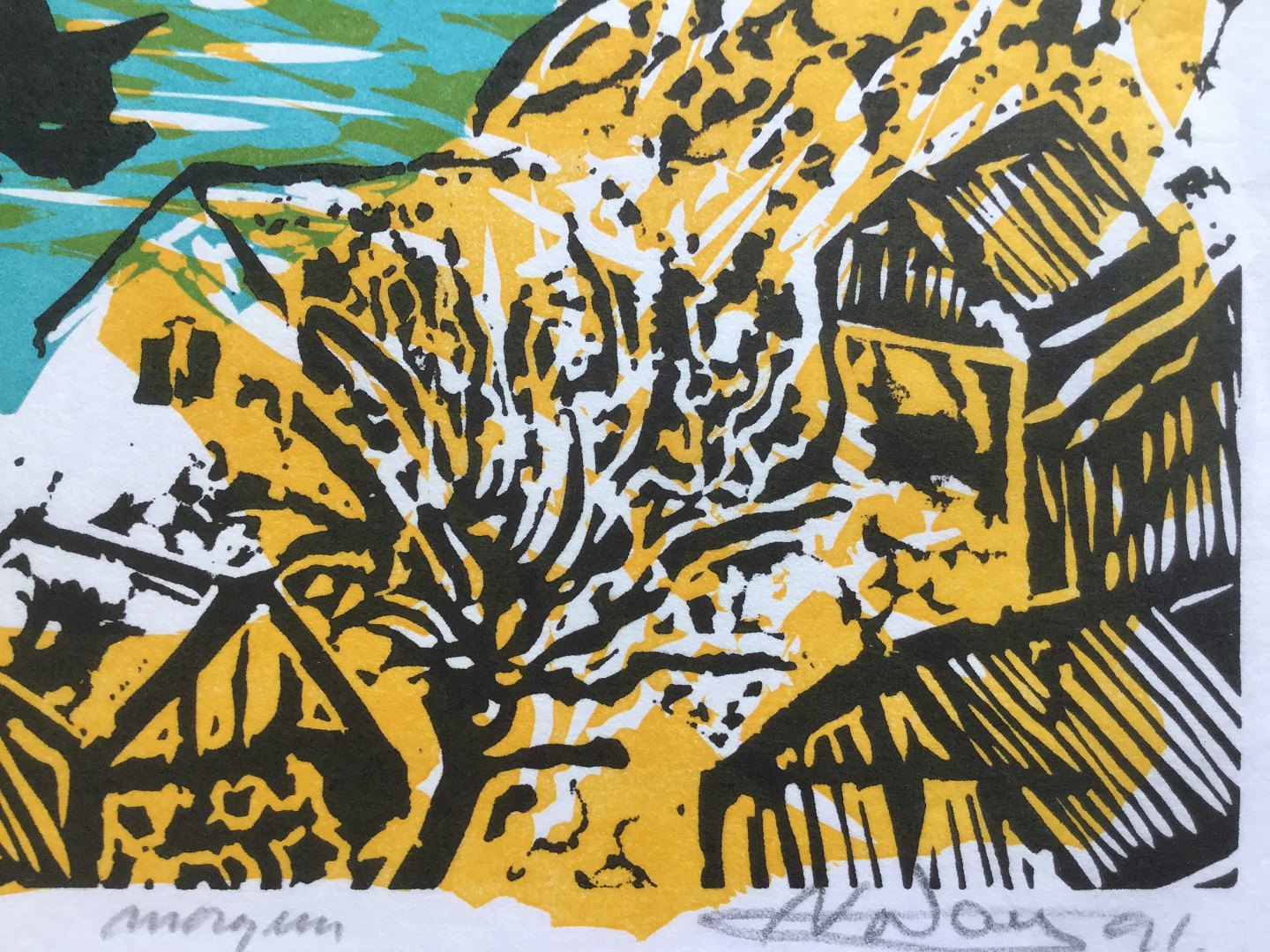 Farvetræsnit af Amariel Nordoy 1991 - Færøsk fjordparti.