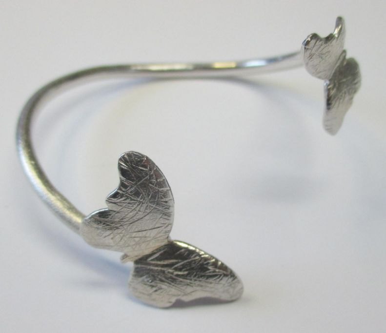 Design armring af sterling sølv, Matogi group, Odense, (efter 2010), Danmark. Detkoreret med sommerfugle. Stemplet. Dia.: 6 cm. Vægt.: 20,1 gram.
