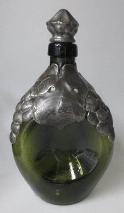 Grøn flaske med tin montering, 1920 - 1930, Danmark. Højde.: 23 cm.