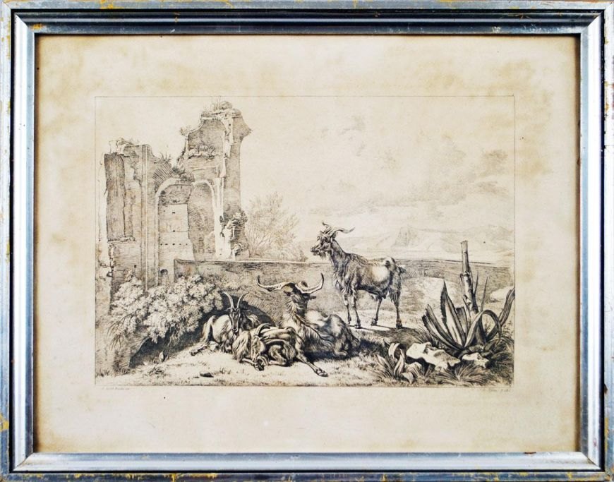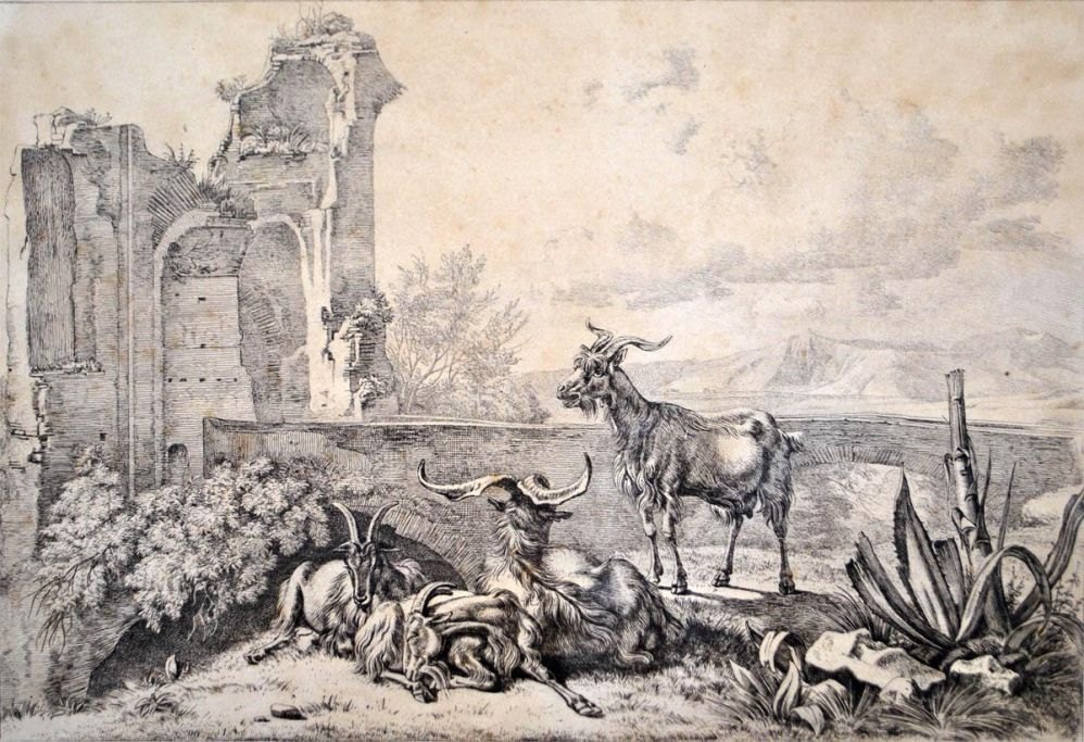 Klein, Christian Leonhard (1810 - 1891) Denmark. Goats on the ground, Italy. Engraving. Signed. 18 x 25 cm.