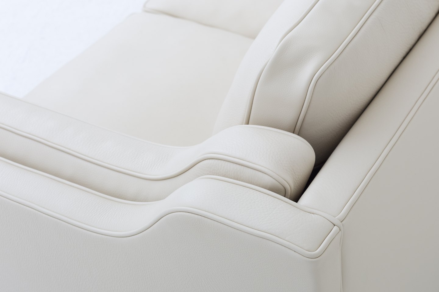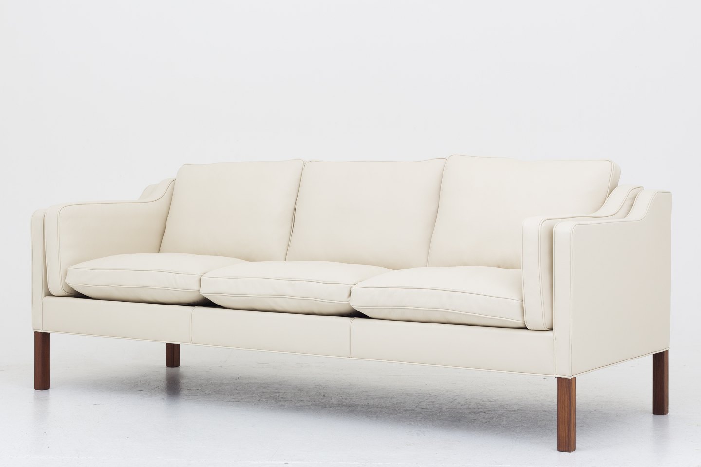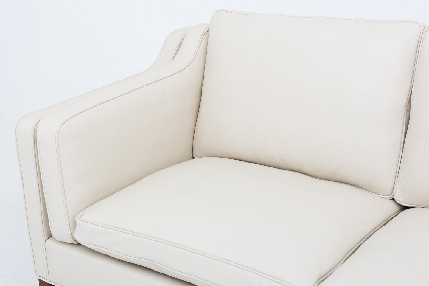BM 2213 - Nybetrukket 3 pers. sofa i cremefarvet Paris Cream-læder med ben i mahogni. Vi tilbyder polstring af sofaen med stof eller læder efter eget valg