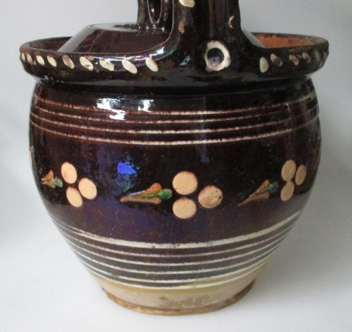 Maternity, Winther (1838 - 1919) Sønderborg, 19th century. Denmark. With handle and dark brown glaze exterior. Decorated with flowers. Lid decorated. Height: 34 cm. With hair crack in the lid.