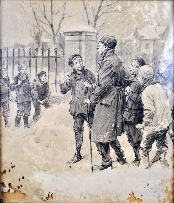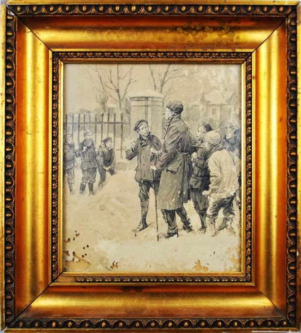 Henningsen, Erik (1855 - 1930) Dänemark. Schneeballschlacht. Tusche. Verso bezeichnet. 26 x 22 cm.