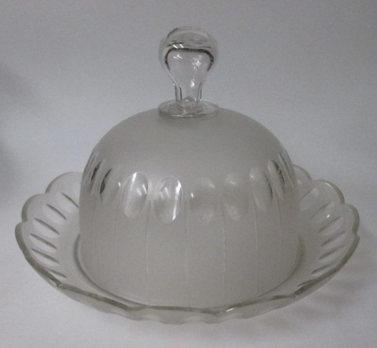 Oste klokke med underskål, ca. 1920. Danmark. Klart sandblæst glas. Klokke med slibninger. Højde: 17 cm. Dia.: 24 cm.