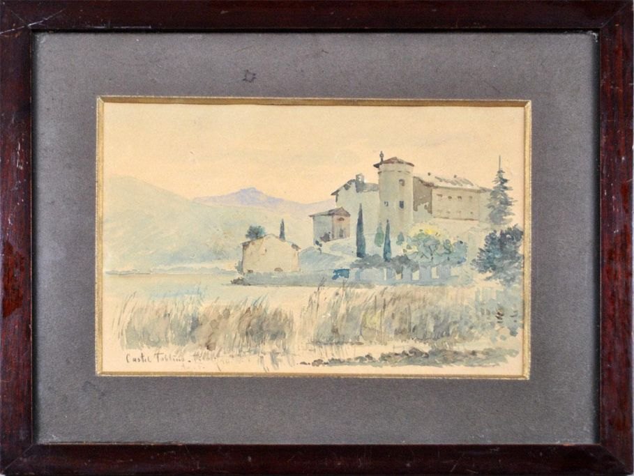 Fischer, August (1854 - 1921) Denmark. Castel Toblino. Watercolor. Signed: Aug. F 90. 17 x 24 cm.