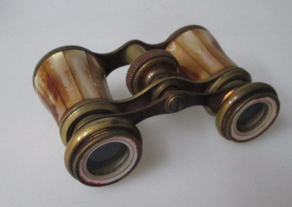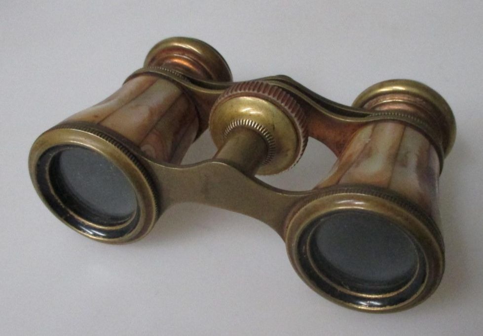 Theater binoculars, 20th century. France. Brass and mother of pearl. 7.5 x 9.5 cm.