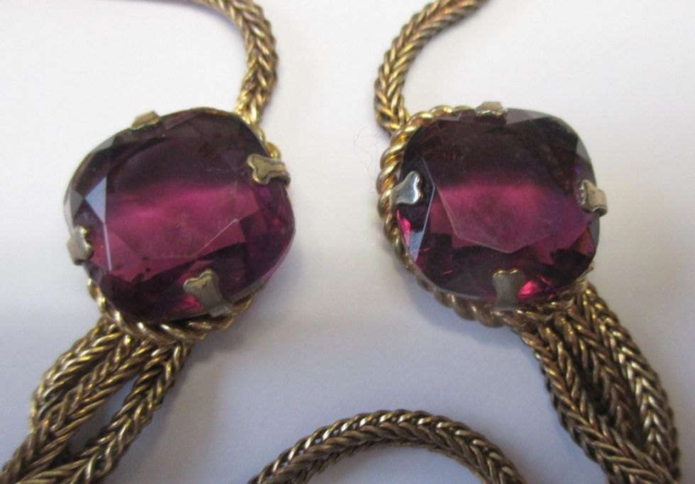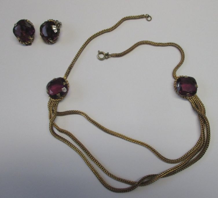 Smykkesæt bestående af halskæde og øre clips, 20. årh. Forgyldt med slebne spineller. Længde kæde.: 39 cm.