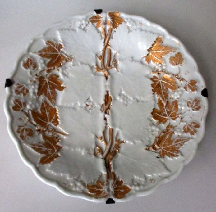 Meissen plate, 19th century. White porcelain with gildings. Decoration in the form of wine leaves and grapes. Stamped. Dia: 21.8 cm.