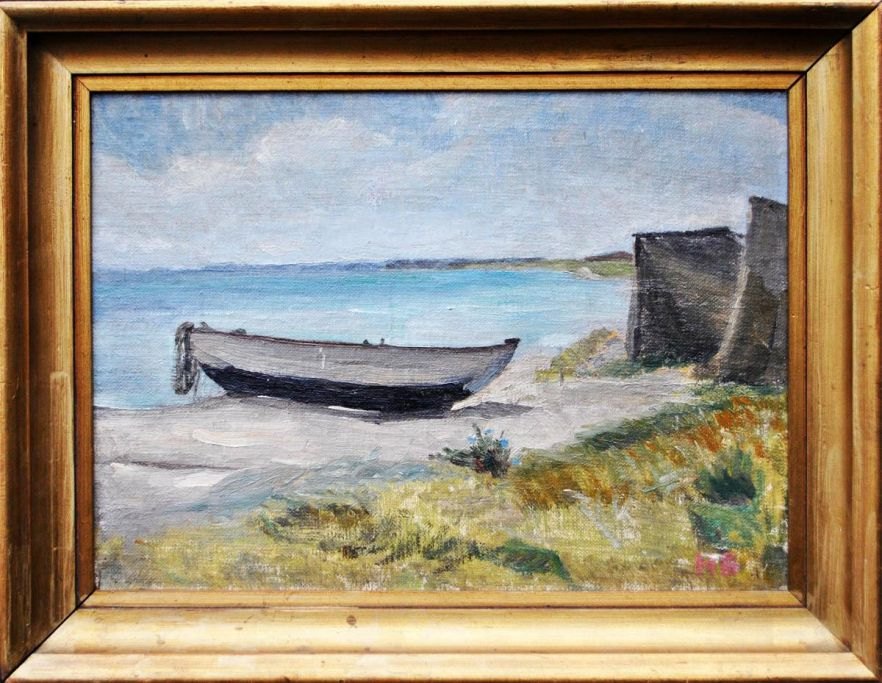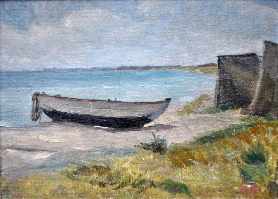 Dansk kunstner, 19. årh.: Kystscene. Olie på lærred. Signeret: HB. 26 x 35 cm.