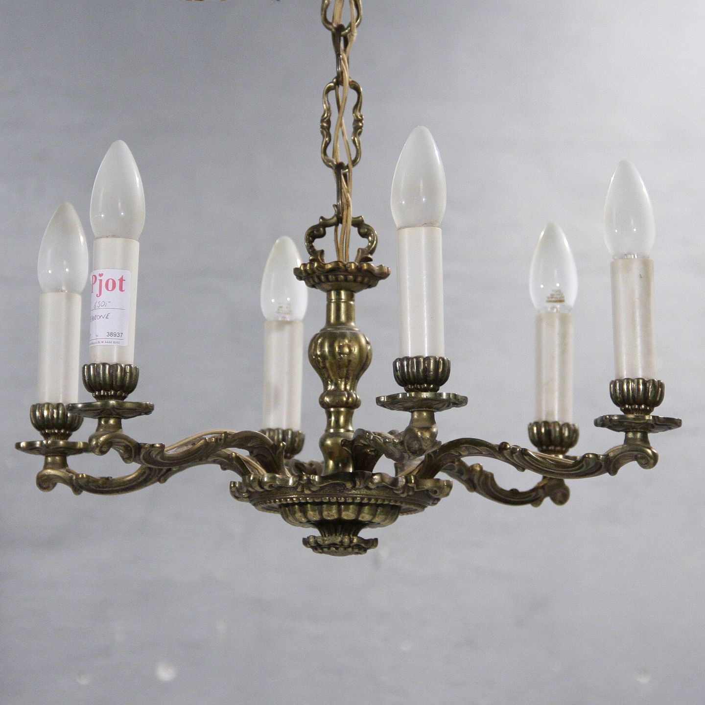 6-armet lysekrone i messing, 47 cm i diameter, 1950-1960
