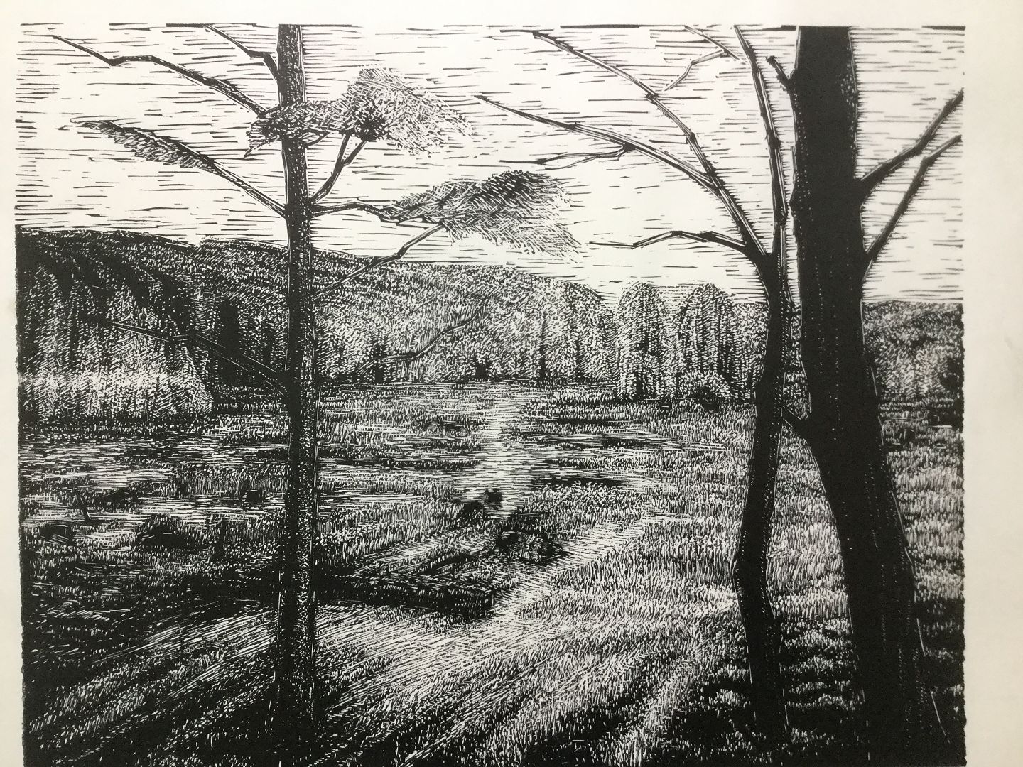 Linoleumssnit på papir.