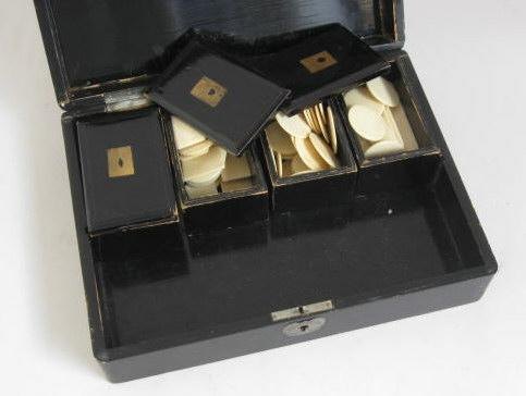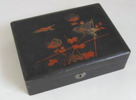 Card game box, Japan, 1900s. Lacquer with decoration with birds and flowers. In addition, decoration of bird in bronze. Inside four boxes with chips made of bone. L: 25 cm. B: 18.5 cm. and H: 7 cm.  One  of the lids is missing for the smaller boxes. With minor defects.