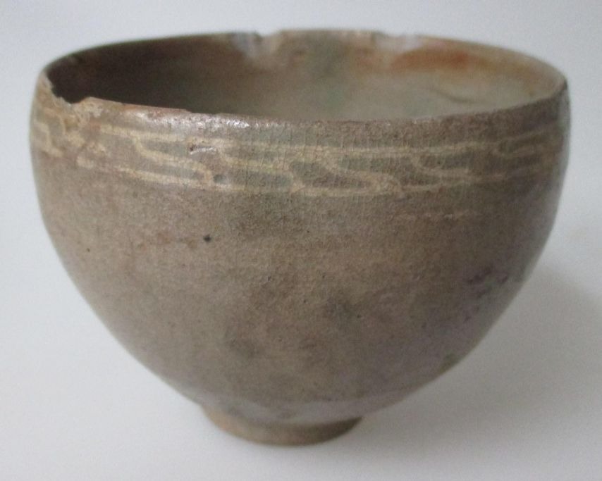 Antik lertøjs skål - jordfund - Korea. Højde.: 6,5 cm. Gråglaseret med dekoration.