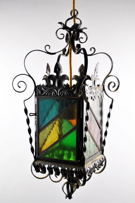 Ampel in small forging work, approx. 1900. Denmark. With stained glass. H. 47 cm.