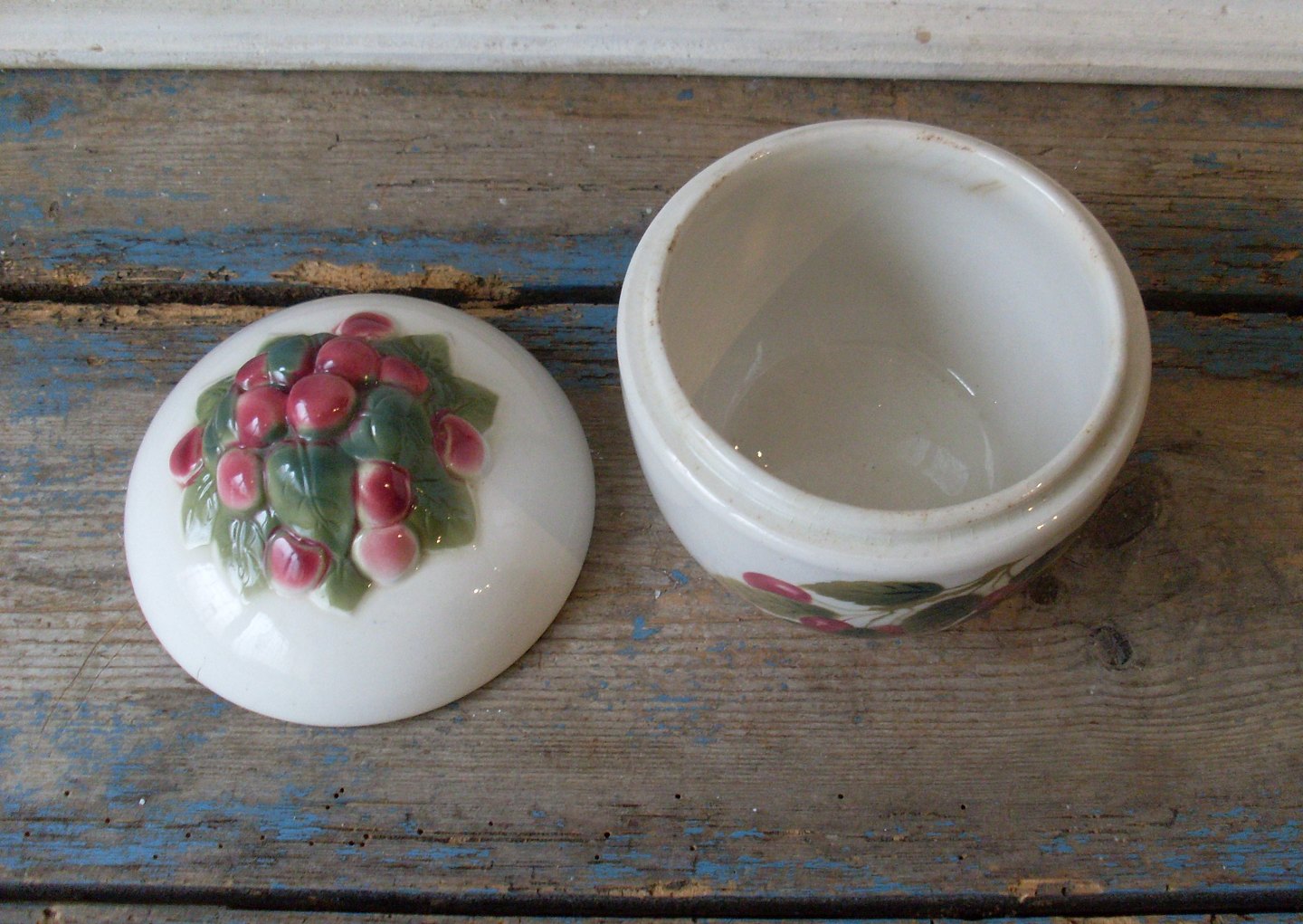 Aluminia marmeladekrukke dekoreret med røde kirsebær fra 1928.