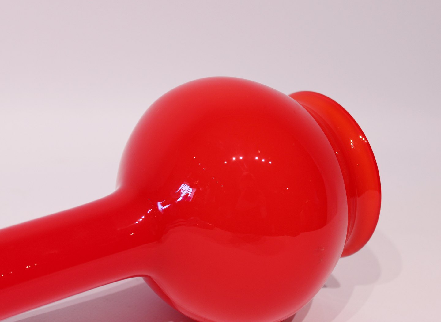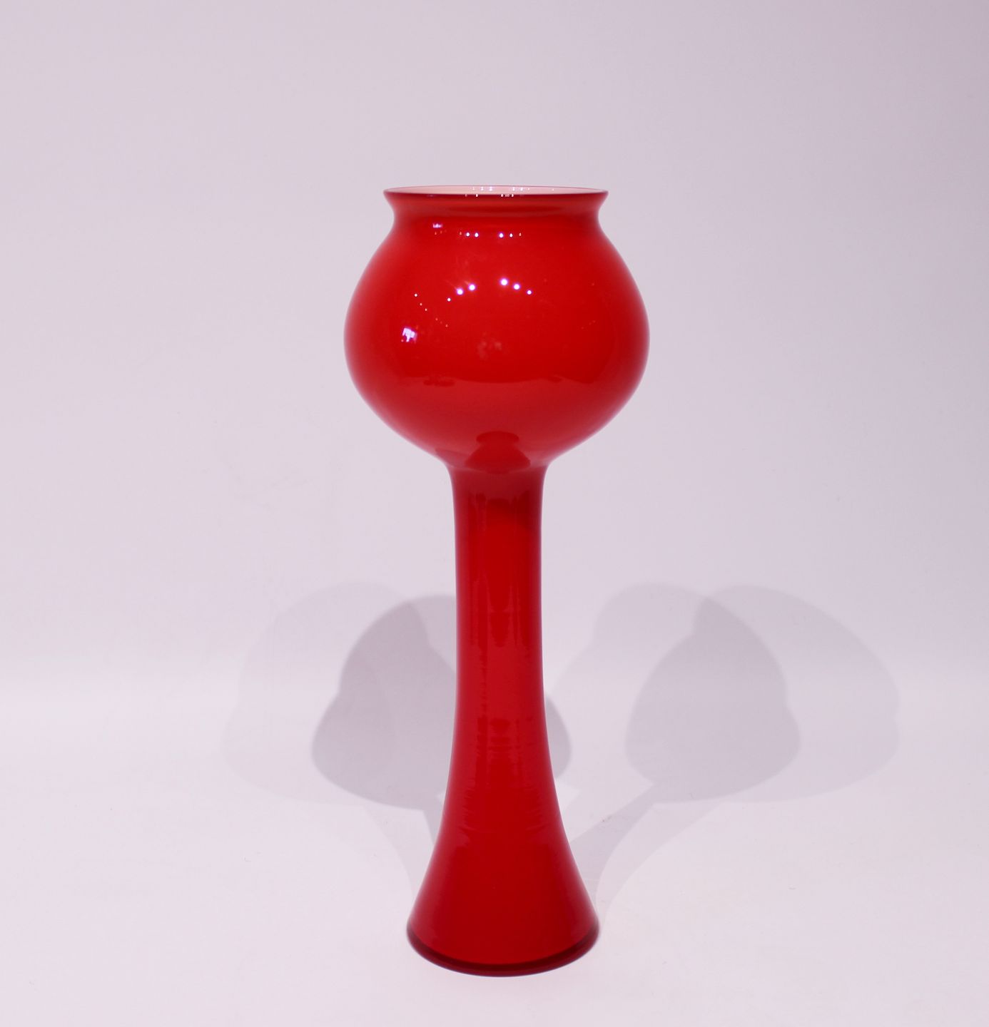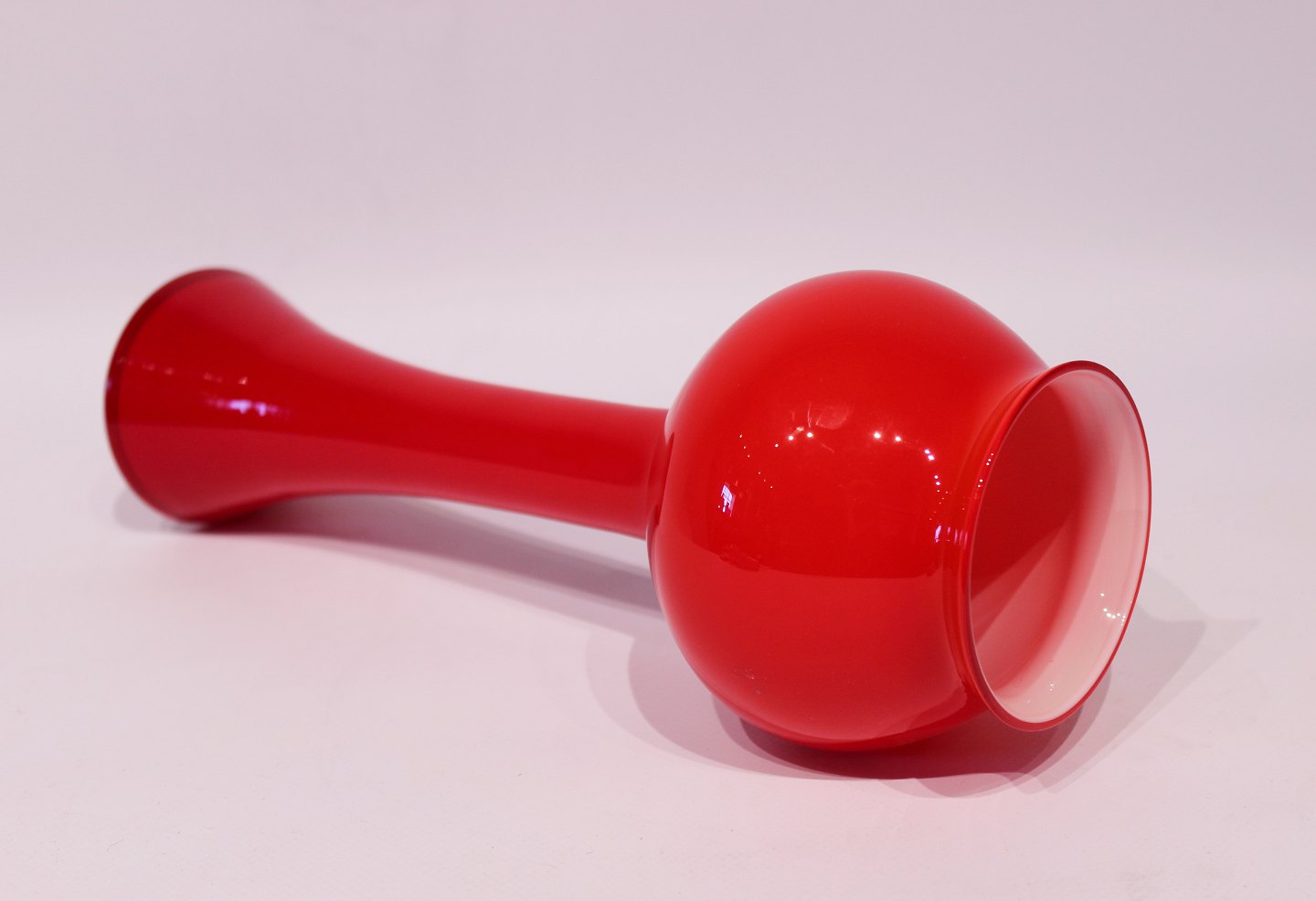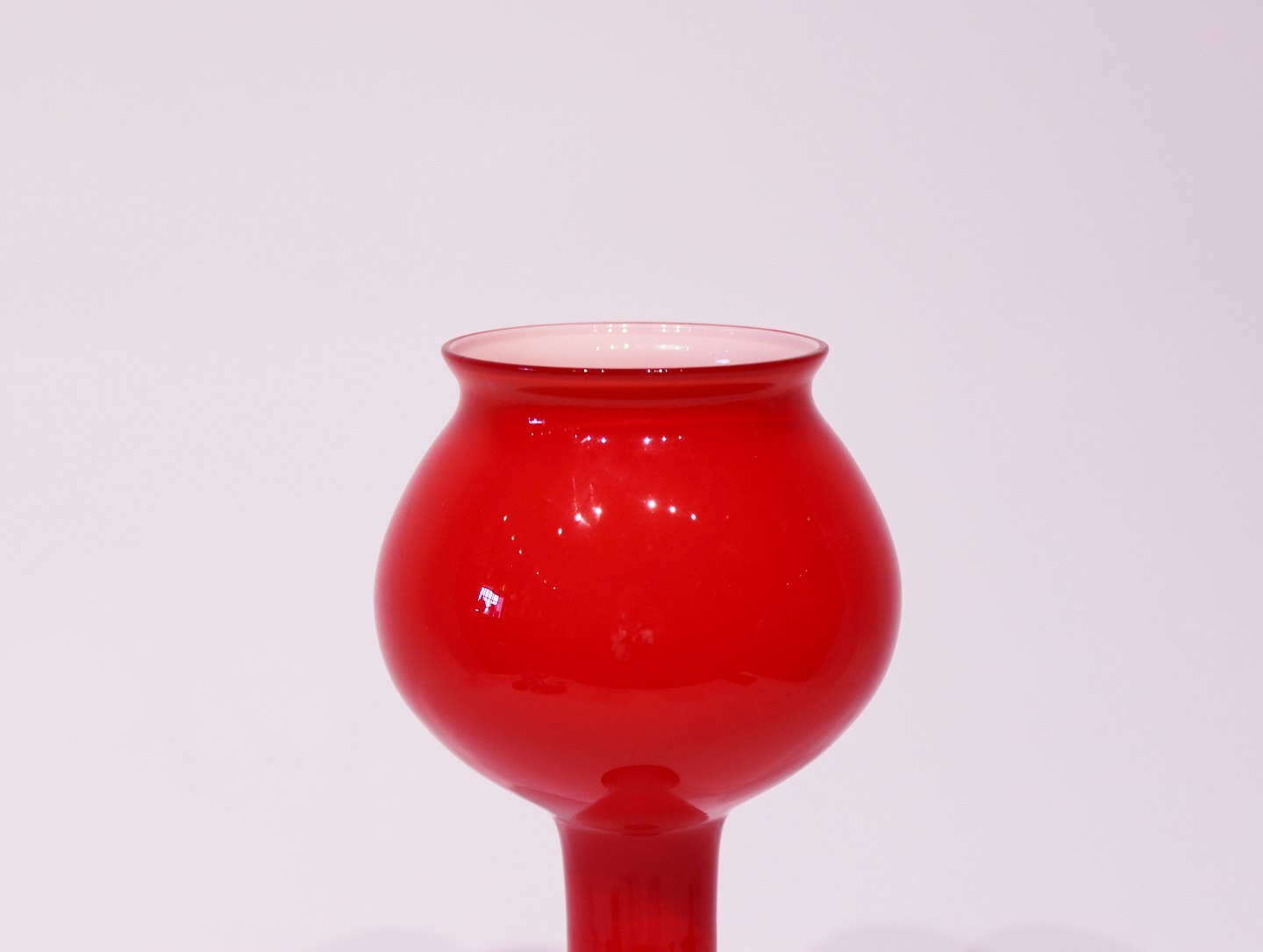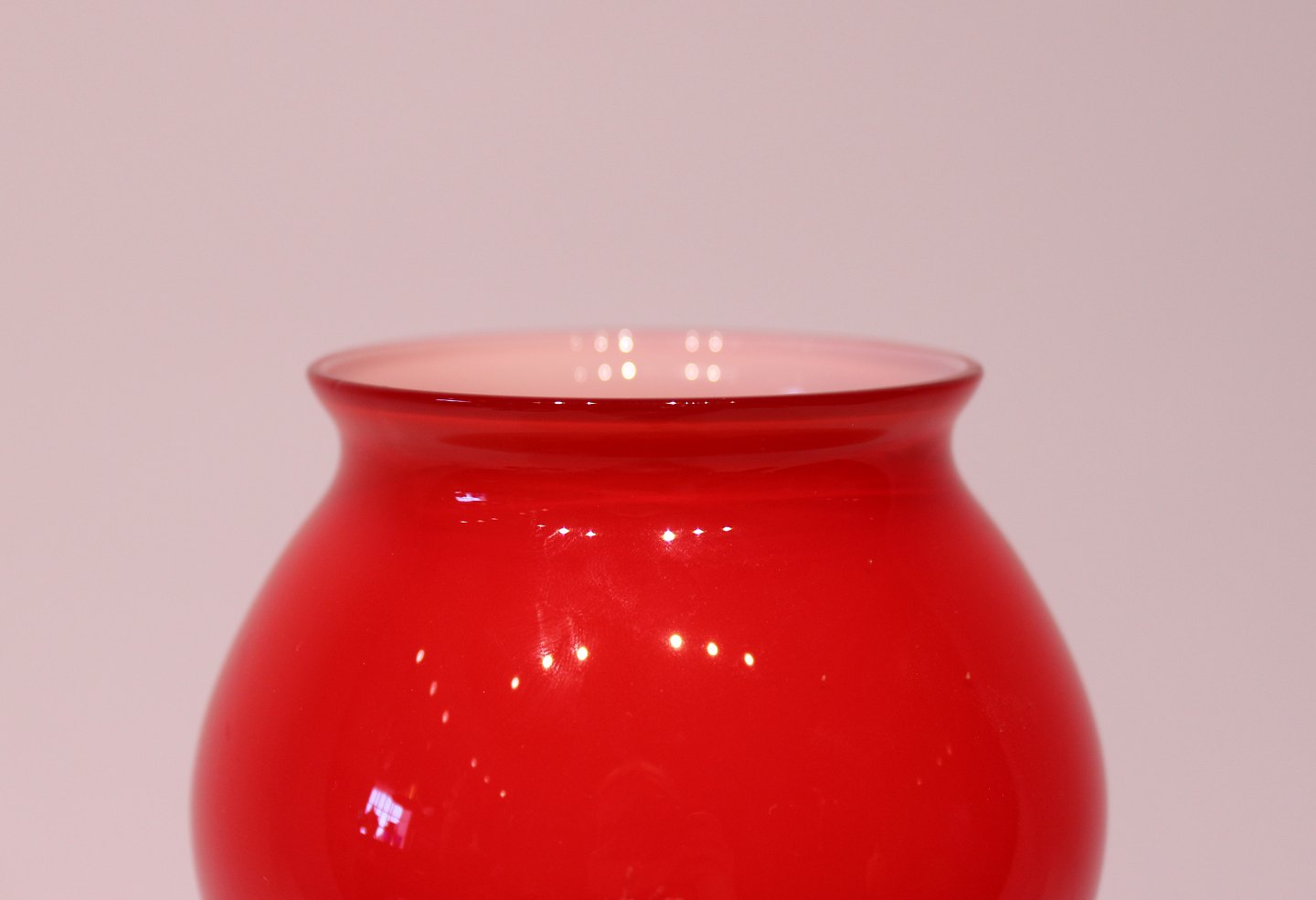 Høj rød glasvase med hvidt opalglas indvendig fra Holmegaard.
