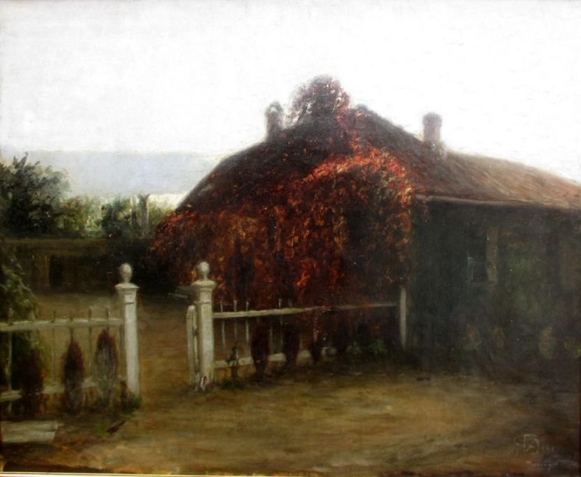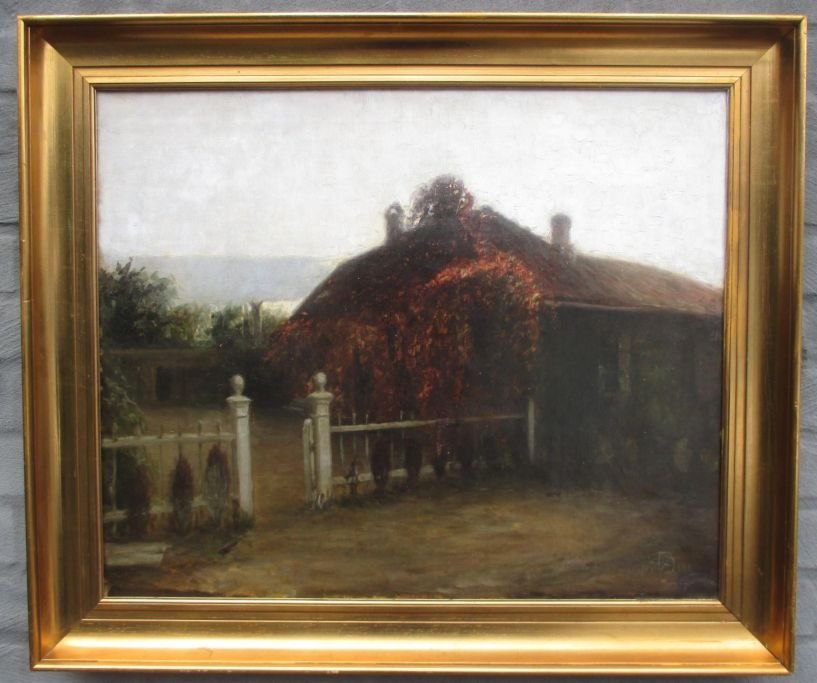 Dansk kunstner (20. årh.): Et hus i modlys. Signeret.: Monogram 1919. Olie på lærred. 50 x 62 cm.