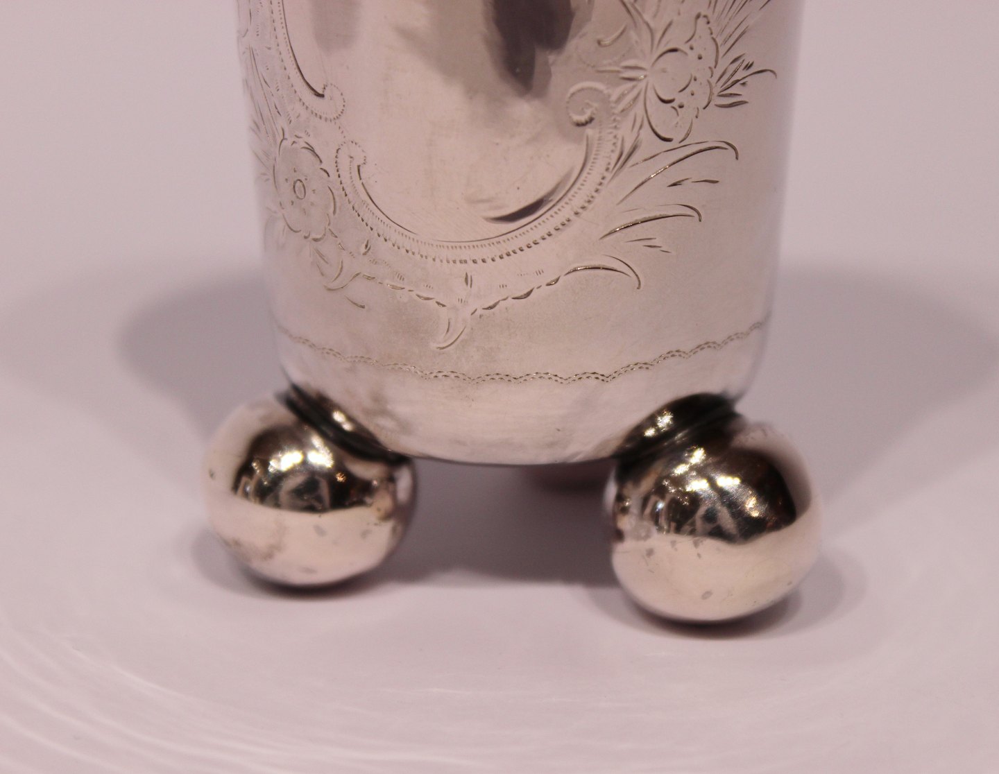Lille bæger på kugle fødder dekoreret med ciseleringer i 830 sølv fra starten af 1800 tallet.